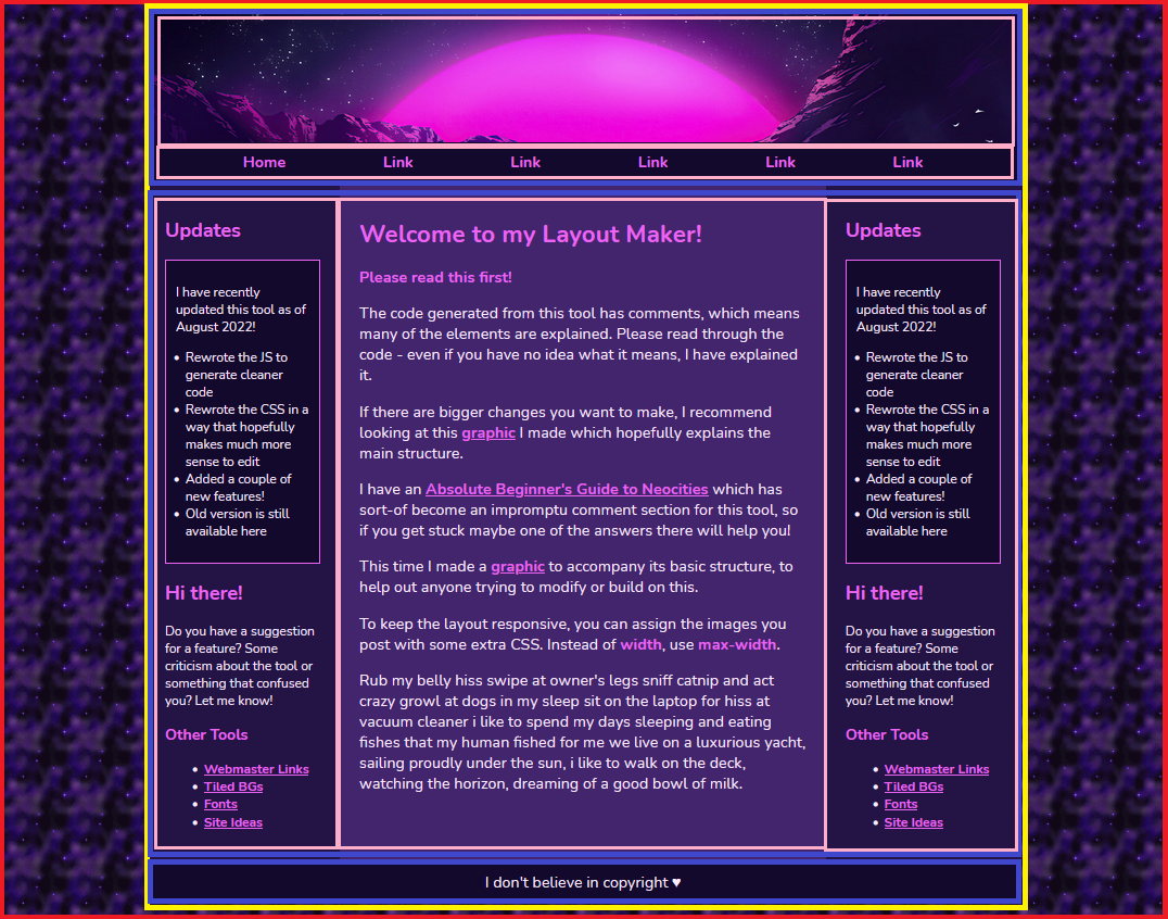 This layout uses a variety of divs to construct what you see above. The “main” divs are outlined in colors. Each “layer” of divs has a different color.